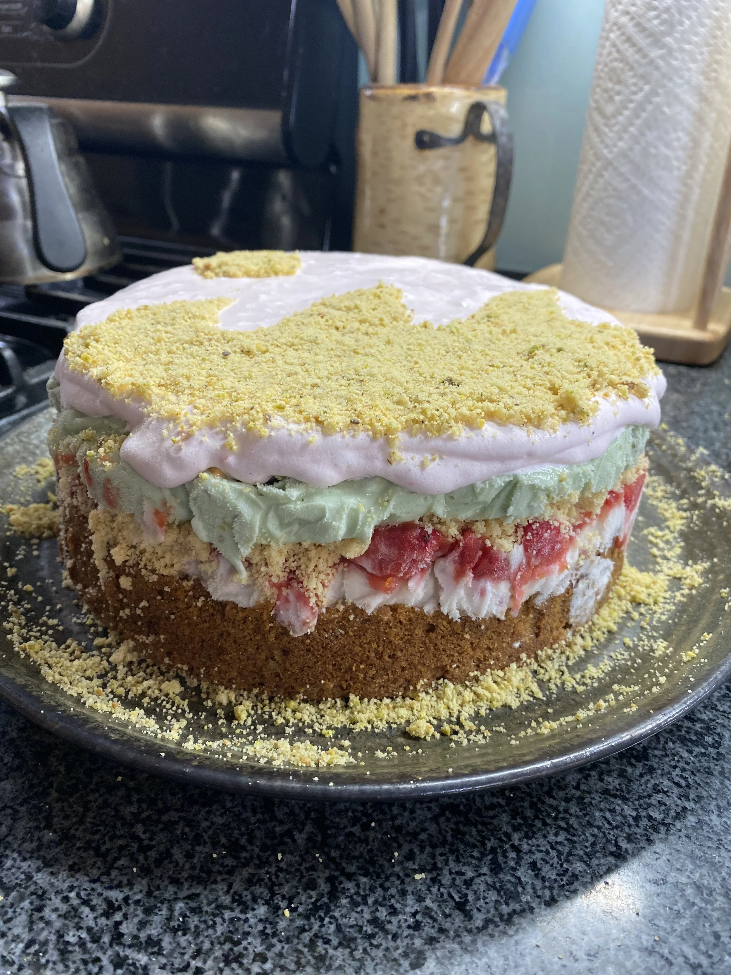 Pistachio blondie, vanilla ice cream swirled with raspberries, raspberry jam & shortbread cardamom crumble, pistachio ice cream, berry whip cream, shortbread sand