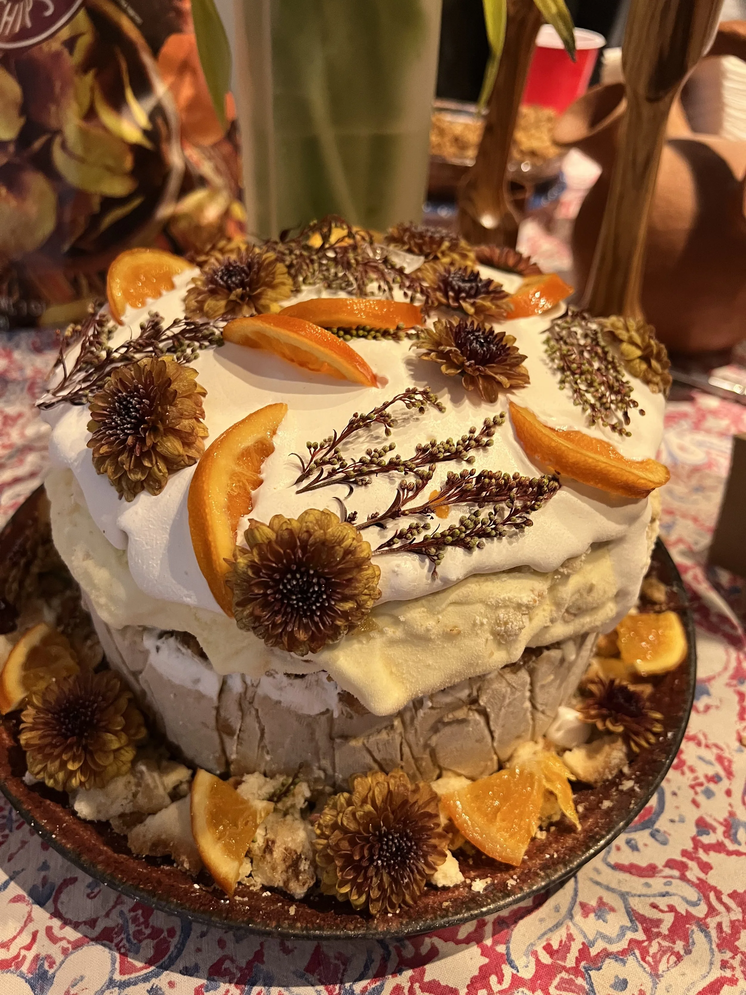 Pumpkin spice cake, pumpkin ice cream, pie crust crumble, vanilla bourbon ice cream with pie bites, cointreau whipped cream, dried flowers & candied orange